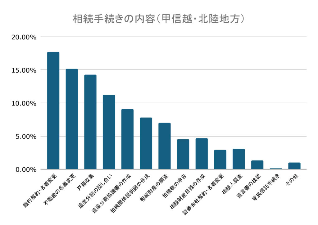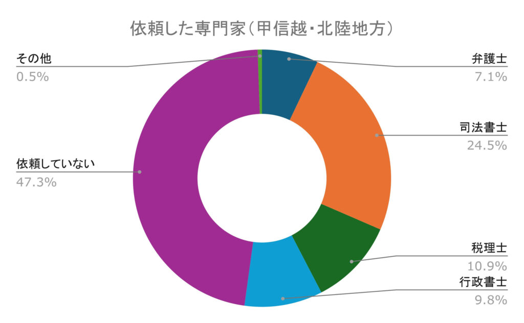 その一方、専門家に依頼していない割合は47.28%でした。したがって甲信越・北陸地方の半分程は専門家に相続手続きを依頼したと言えます。