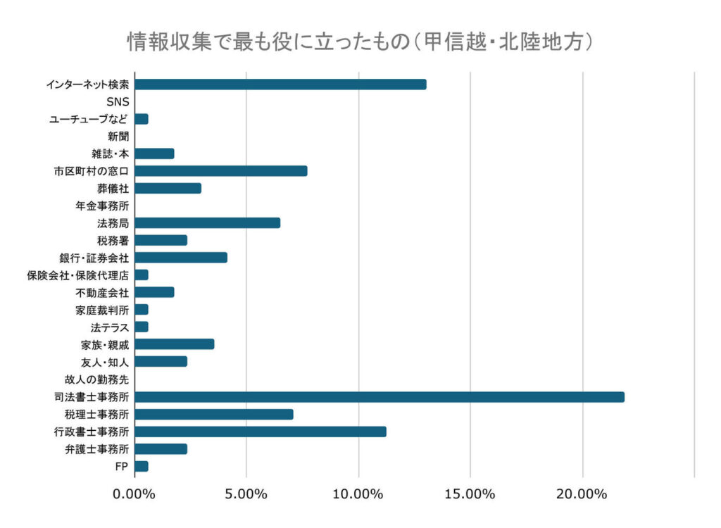 また甲信越・北陸地方の人の相続では、情報収集の手段としては司法書士事務所をと答えた人が最も多かったです。