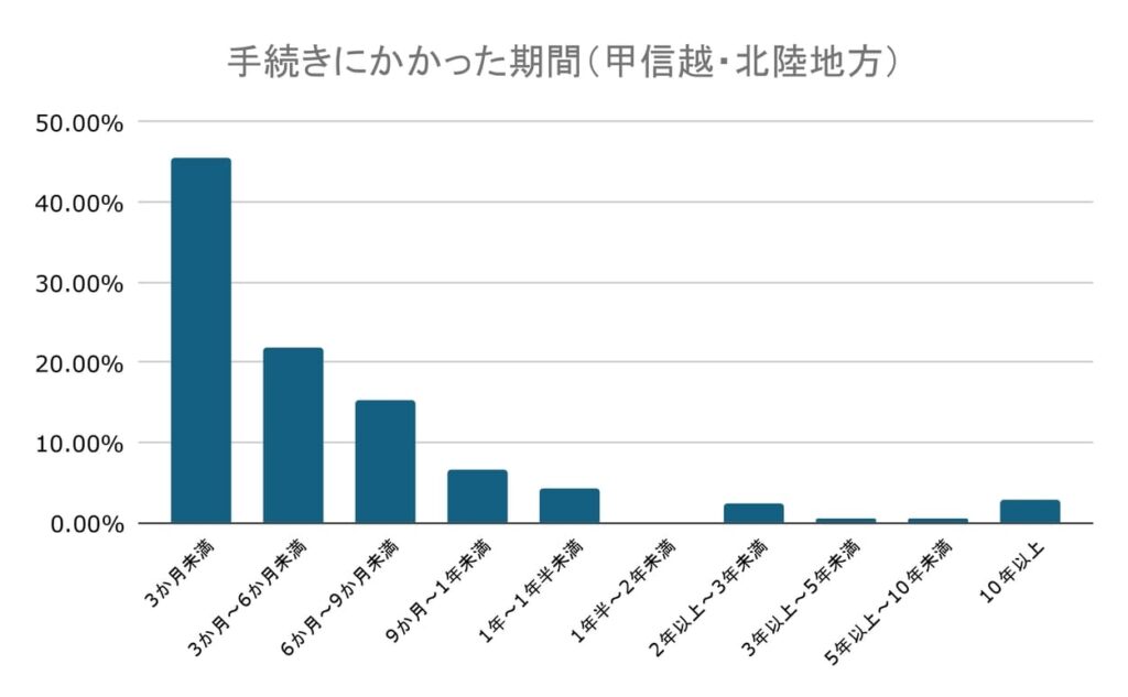 5年以上~10年未満が0.59%、10年以上が2.96%と、5年以上手続きがかかる場合はまれです。手続きが面倒になって長引いている場合も考えられます。