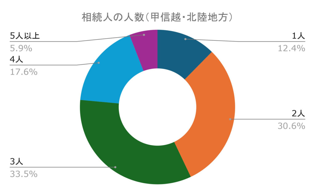 甲信越・北陸地方の相続では、相続人3人が33.53%と最も多く、次いで2人が30.59%、4人が17.65%、1人が12.35%、5人以上が5.88%となりました。