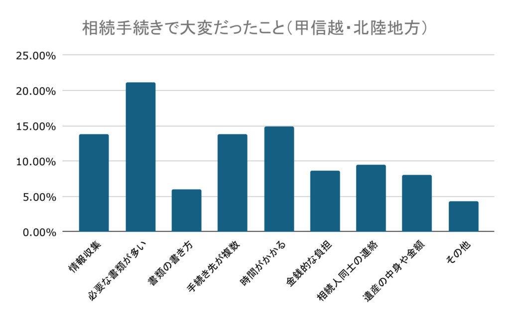 甲信越・北陸地方の相続で大変だったことという質問では、「必要な書類が多い」が21.20%と最多となりました。また「時間がかかる」が14.90%、「情報収集」と「手続き先が複数」が同じで13.75%と続きます。
