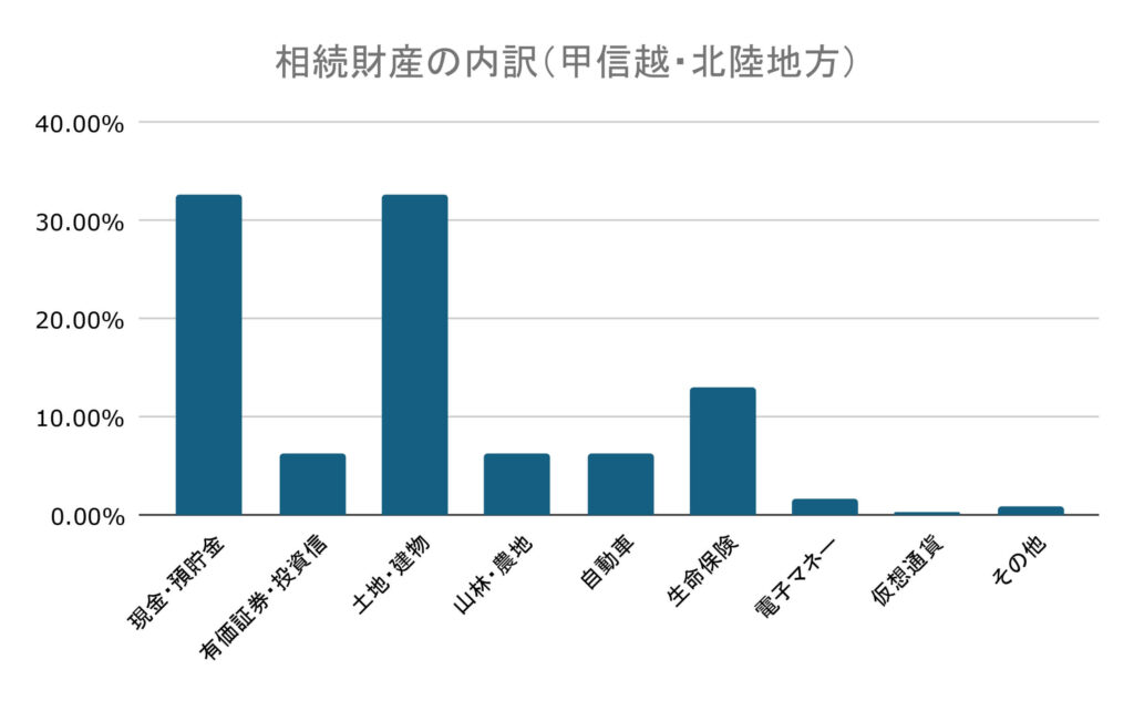 甲信越・北陸地方の相続の相続財産内訳は現金・預貯金と土地・建物が同じで32.63%でした。