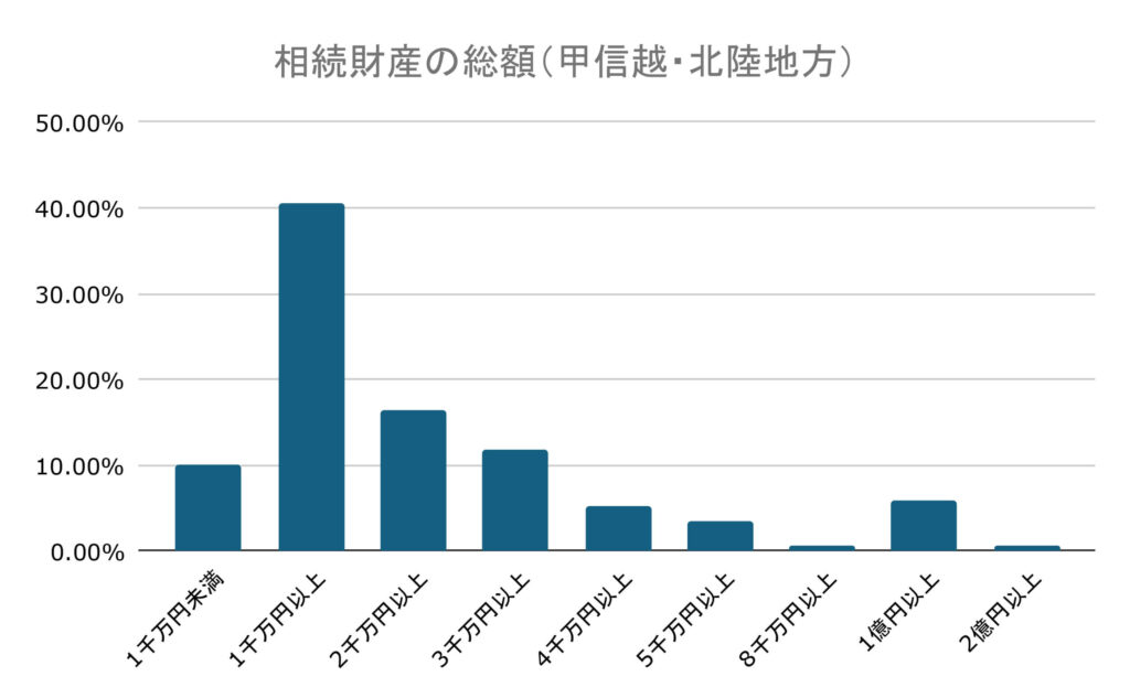 甲信越・北陸に住む人の相続では相続財産の総額が1,000万円以上~2,000万円が最多で、40.59%となりました。