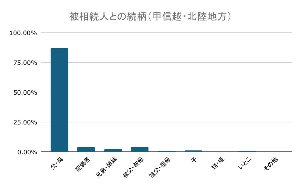 甲信越・北陸地方の相続について、被相続人(亡くなった人)との続柄は、父・母が他より圧倒的に多く87.06%でした。父母の相続がほとんどであることがわかります。