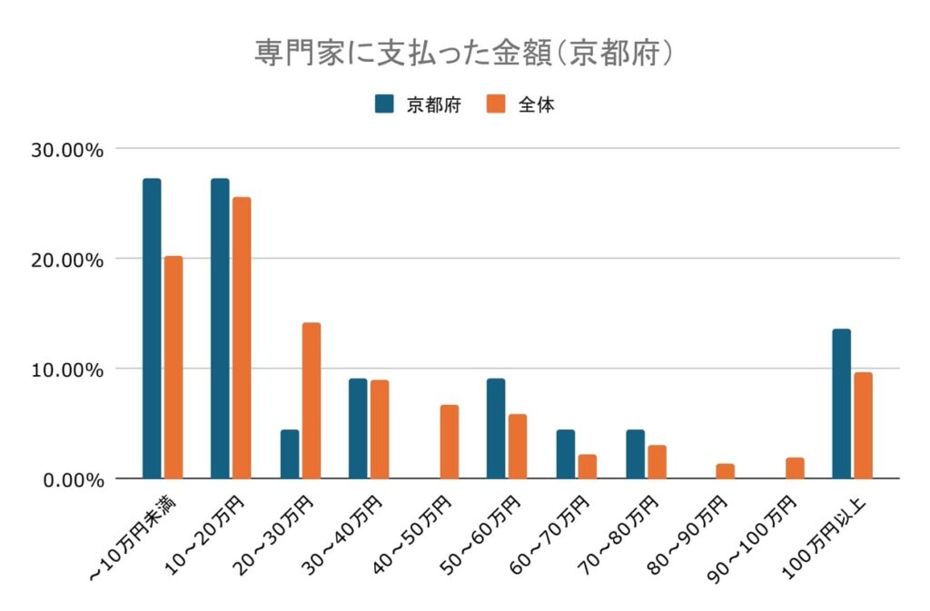 専門家に支払った金額のアンケートでは、10万円未満と10万円以上~20万円未満が同じく27.27%でした。