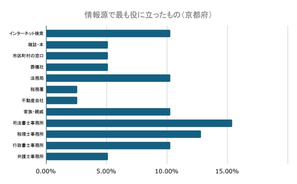 相続手続きに関する情報収集でもっとも役に立ったものとしては、司法書士事務所が最も多く15.38%でした。