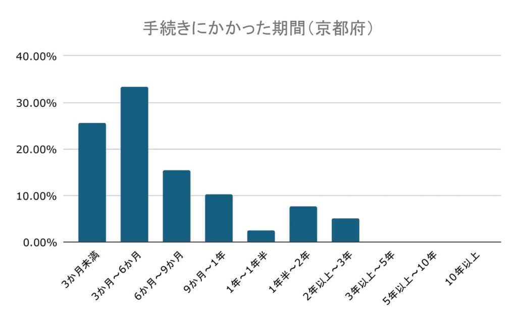 その一方、1年~1年半未満が2.56%、1年半~2年未満が7.69%、2年以上~3年未満が5.13%と、少数ではあるものの手続きが長期間にわたる場合も見られます。