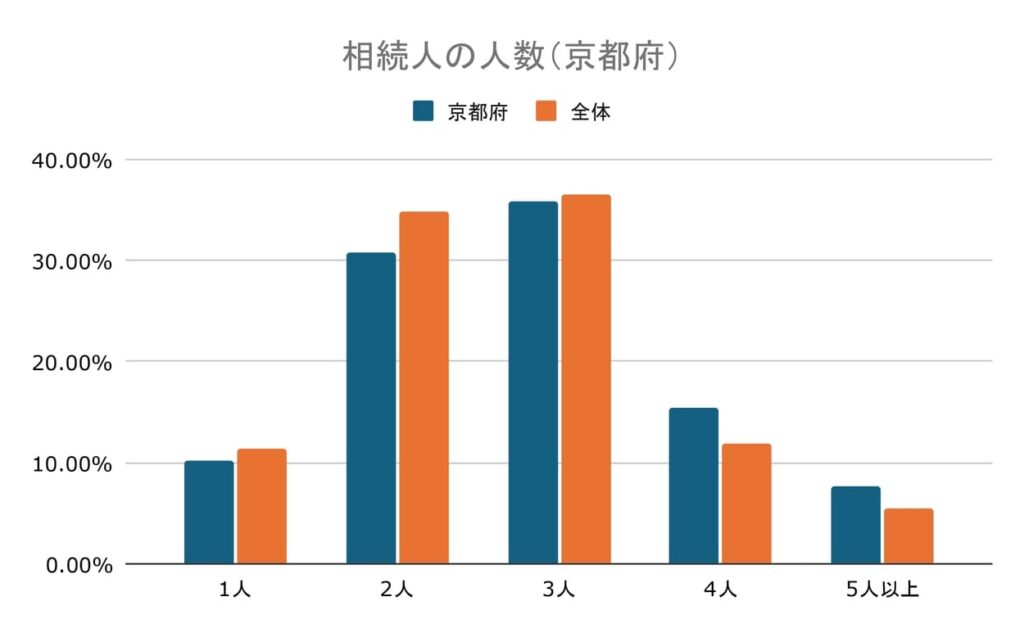 京都府の相続では相続人3人が35.90%と最も多く、次いで2人が30.77%、4人が15.38%、1人が10.26%、5人以上が7.69%となりました。