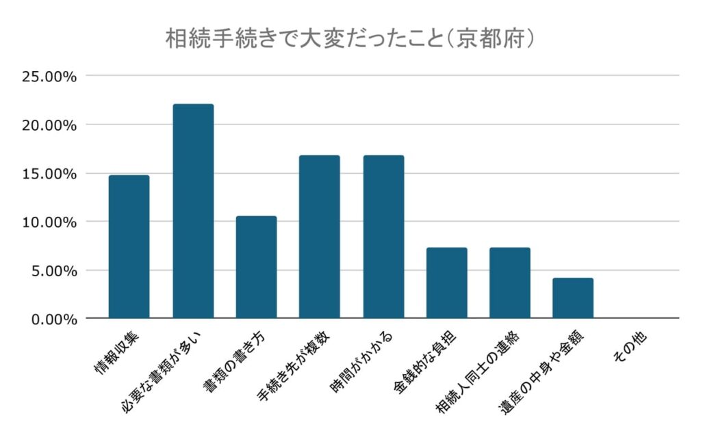 京都府の相続で大変だったことという質問では、「必要な書類が多い」が22.11%と最多となりました。「手続き先が複数」「時間がかかる」が16.84%、「情報収集」が14.74%と多かったです。「書類の書き方」も10.53%でした。