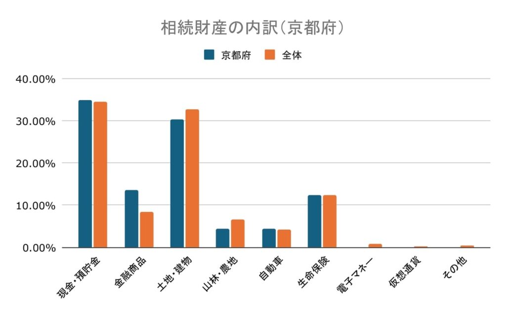 現金・預貯金もしくは土地・建物を相続する人が多く、主要な相続財産であることがわかります。また京都府の人の相続では金融商品が全体よりやや高い傾向がありました。