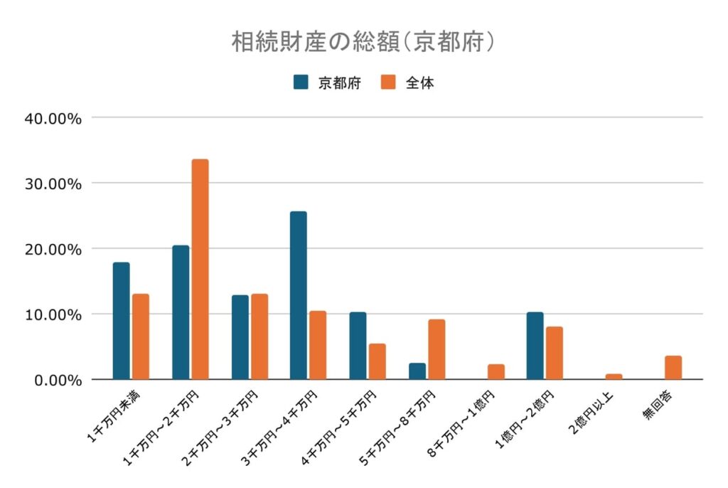 京都府に住む人の相続では相続財産の総額が3,000万円以上~4,000万円未満が最多で25.64%となりました。