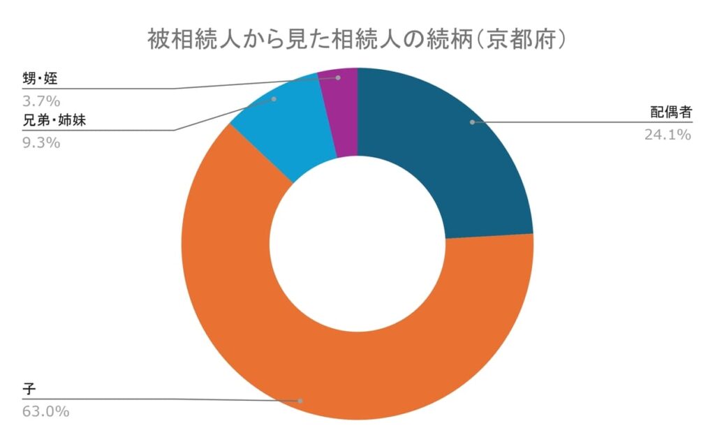 京都府の相続について、被相続人(亡くなった人)から見た相続人との続柄は、子が他よりかなり多く62.96%でした。父母の相続が大多数であることがわかります。