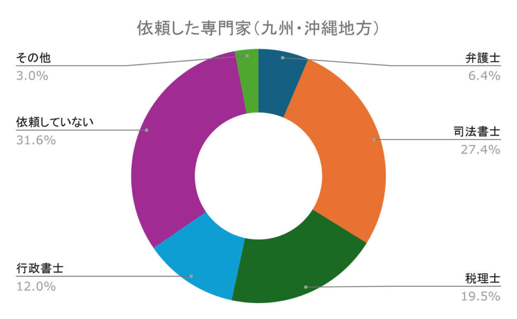 その一方、専門家に依頼していない割合は31.58%でした。したがって九州・沖縄地方の7割程が専門家に相続手続きを依頼したと言えます。