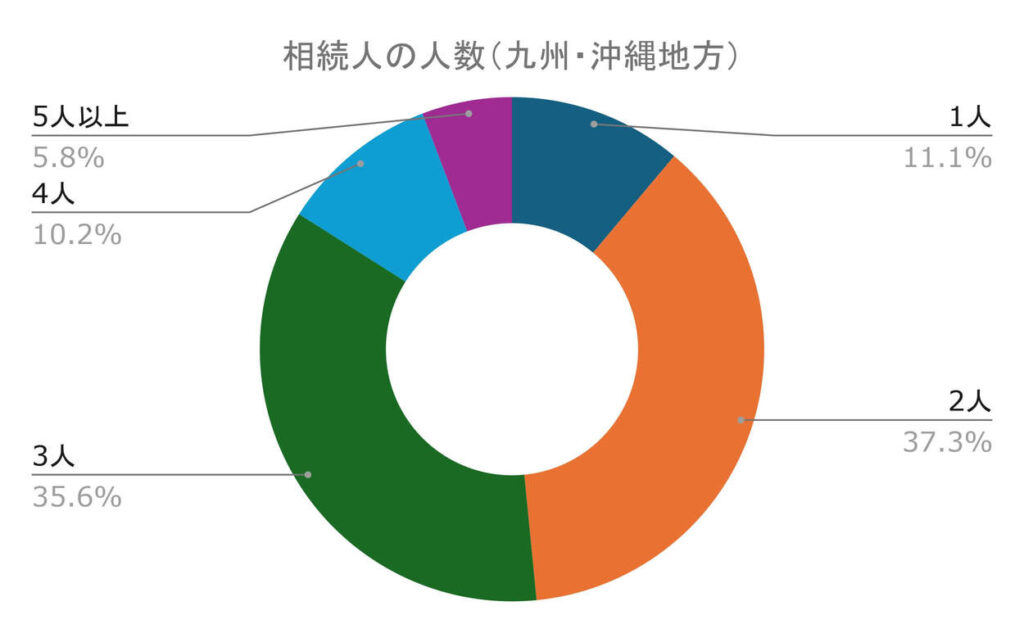 九州・沖縄地方の相続では、相続人2人が37.33%と最も多く、次いで3人が35.56%、1人が11.11%、4人が10.22%、5人以上が5.78%となりました。