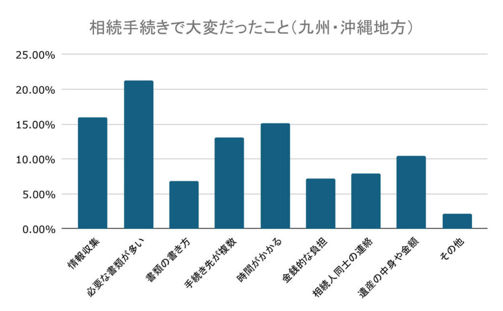 九州・沖縄地方の相続で大変だったことという質問では、「必要な書類が多い」が21.21%と最多となりました。また「情報収集」が15.95%、「時間がかかる」が15.18%、「手続き先が複数」が13.04%と続きます。