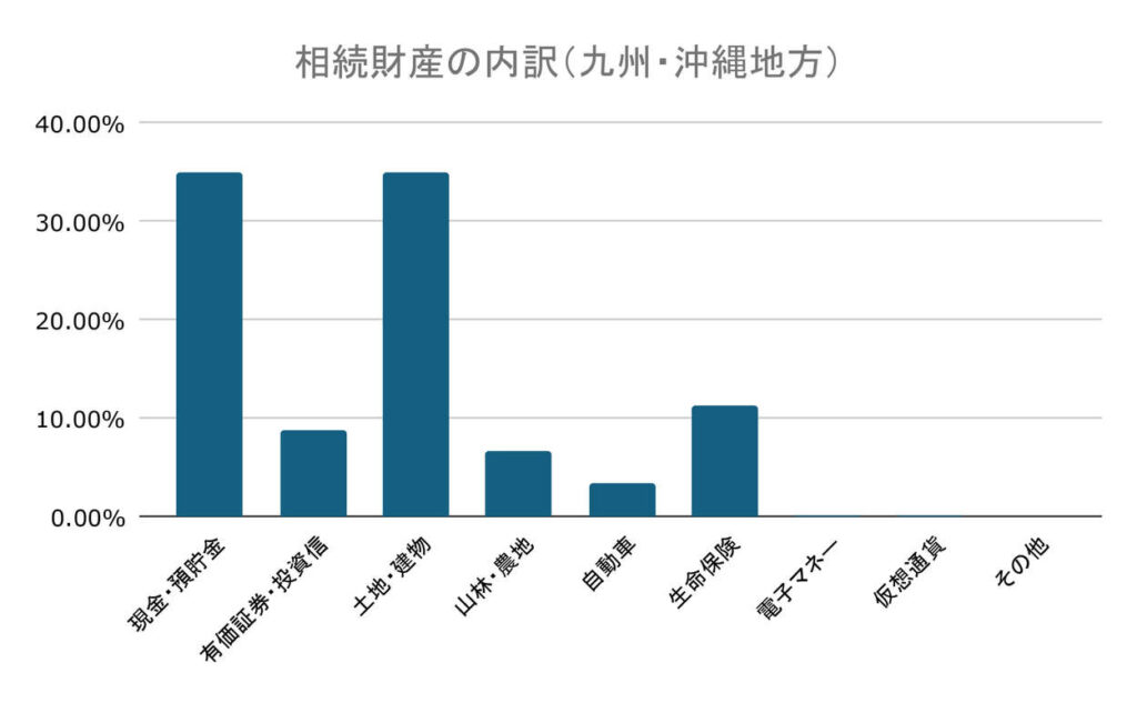 九州・沖縄地方に住む人の相続では、相続財産に現金・預貯金、土地・建物が大半であり、他の相続財産が少ないようです。