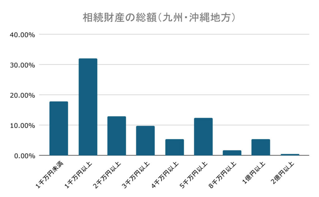 九州・沖縄に住む人の相続では相続財産の総額は、1,000万円未満が17.78%、1,000万円以上~2,000万円未満が最多で、32.00%となりました。