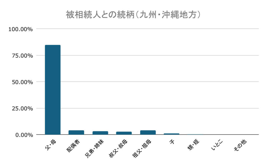 九州・沖縄地方の相続について、被相続人(亡くなった人)との続柄は、父・母が他より圧倒的に多く84.89%でした。父母の相続が大多数であることがわかります。