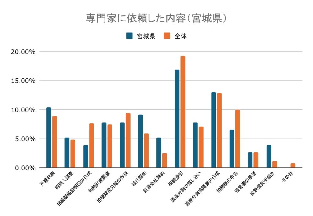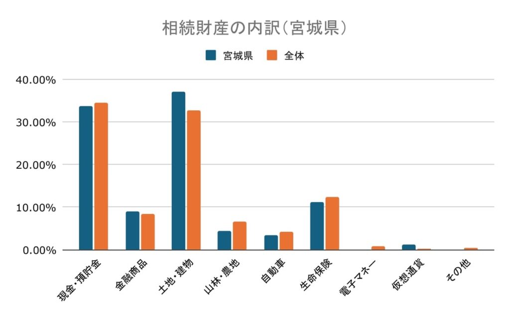 全体と比較すると、宮城県に住む人は土地・建物を相続する割合が多いことが特徴的です。
