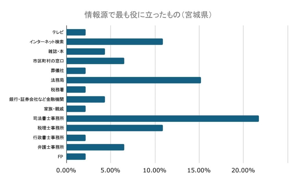 相続手続きに関する情報収集でもっとも役に立ったものとしては、司法書士事務所が最も多く21.74%でした。次に法務局が15.22%でした。