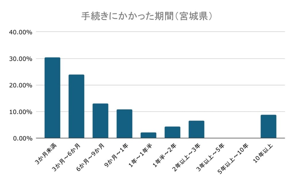 今回は宮城県の相続について解説しました。1年未満で相続手続きが終わる場合があわせて78.26%と、1年かからず手続きが完了する場合が多いようです。また、手続きにかかった期間1年までは徐々に割合が減っていくことがわかりました。