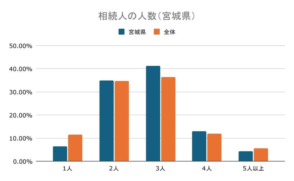 相続人3人と2人をあわせて76.09%となり、宮城県の相続において相続人は2~3人が一般的だと言えます。相続人が4人となるケースも1割以上ありました。