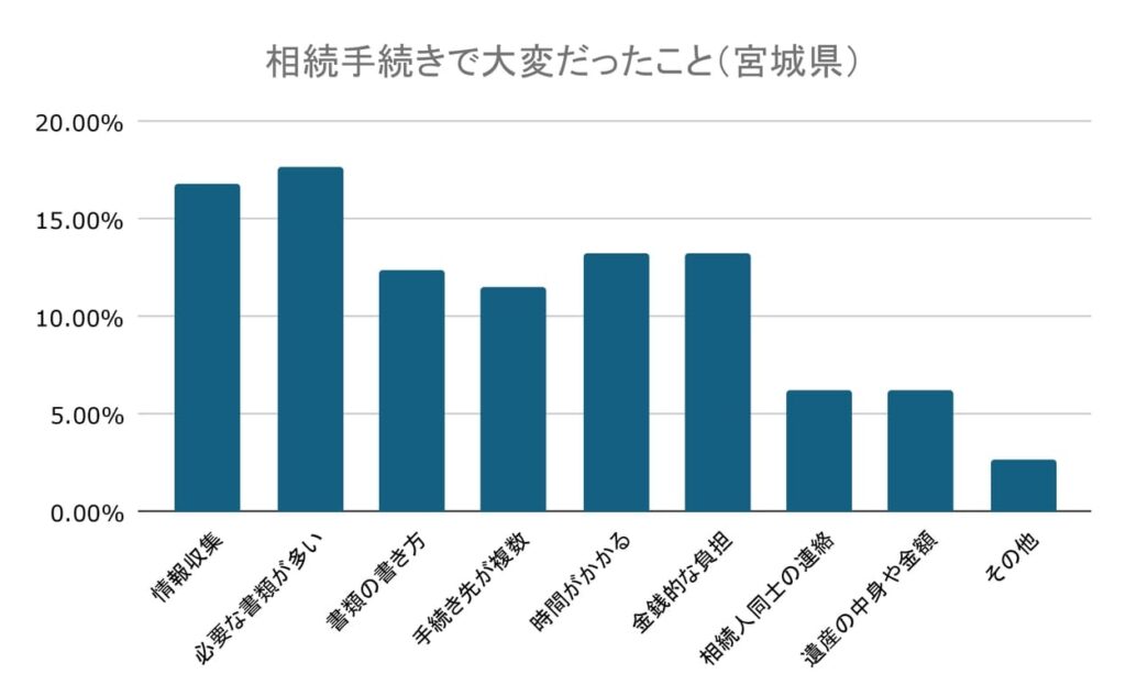 宮城県の相続で大変だったことという質問では、「必要な書類が多い」が17.70%と最多となりました。また、それに続き「情報収集」が16.81%、「時間がかかる」「金銭的な負担」が13.27%でした。「書類の書き方」が12.39%、「手続き先が複数」が11.50%でした。
