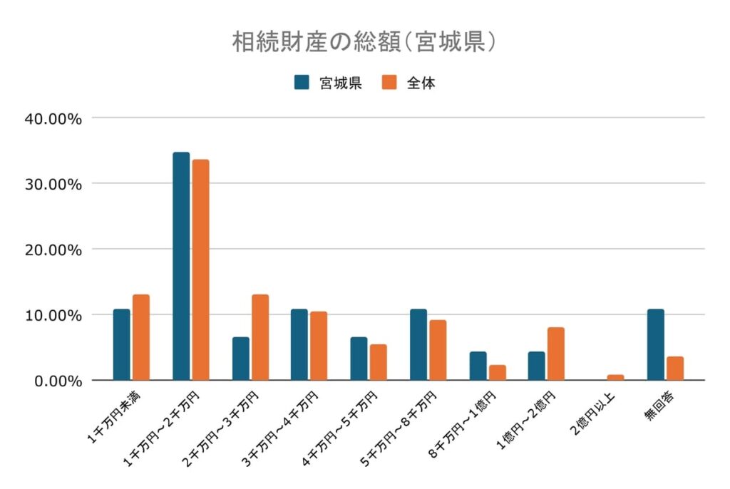 宮城県に住む人の相続では相続財産の総額が1,000万円以上~2,000万円未満が最多で、34.78%となりました。