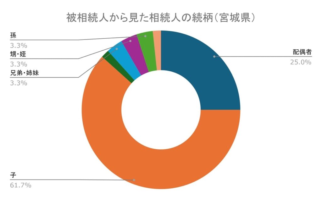 宮城県の相続について、被相続人(亡くなった人)から見た相続人との続柄は、子が他より多く61.67%でした。父母の相続が大多数であることがわかります。
