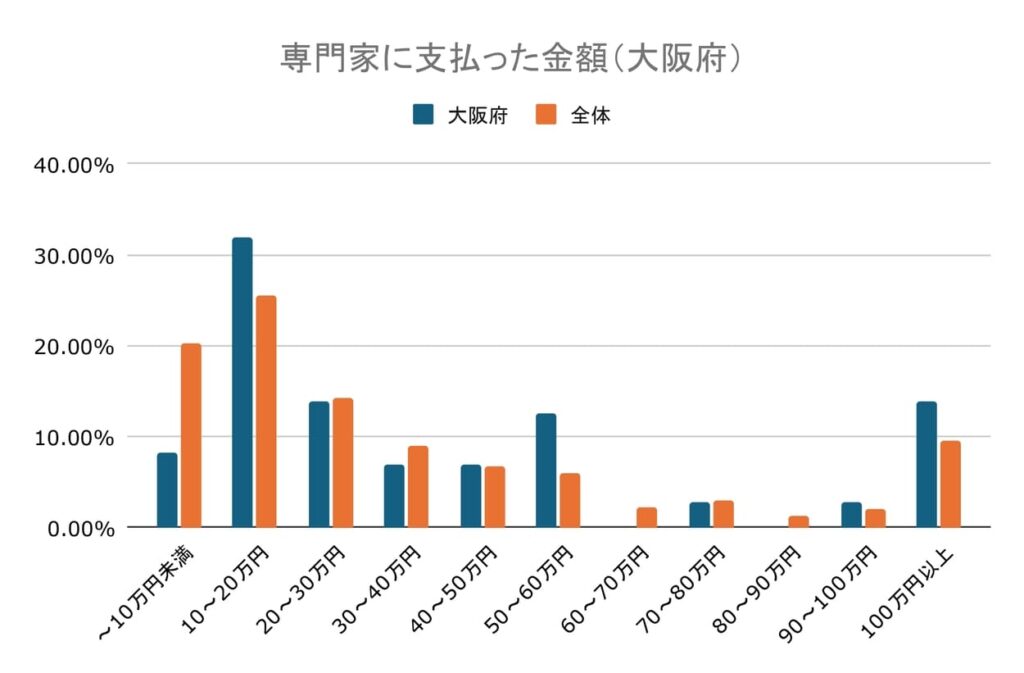 専門家に支払った金額としては、10~20万円が最も高く31.94%でした。次に20~30万円と100万円以上が同じで13.89%でした。50~60万円が12.50%となりました。10万円未満は8.33%です。