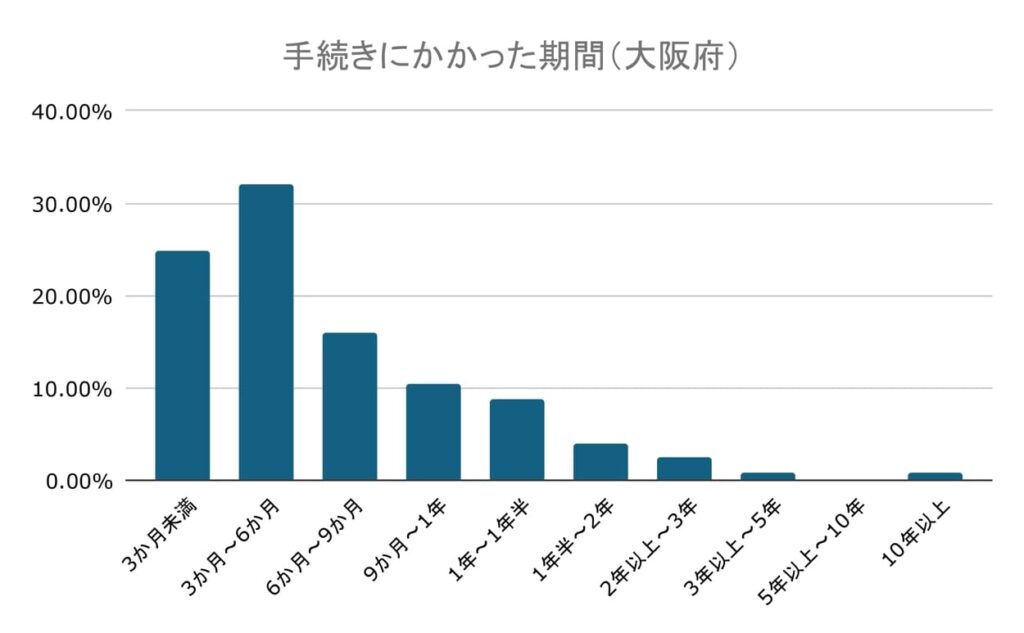 その一方、1年~1年半未満が8.80%、1年半~2年未満が4.00%、2年以上~3年未満が2.40%と、少数ではあるものの手続きが長期間にわたる場合も見られます。