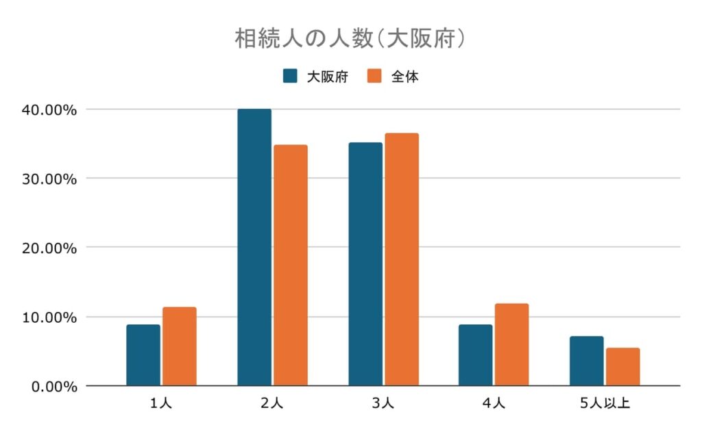 全体と比較すると、大阪府では相続人が2人となる場合が多いようです。