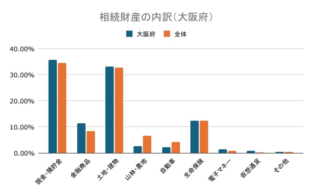 大阪府の相続の相続財産内訳は現金・預貯金が35.71%と最多、次いで土地・建物が33.08%でした。