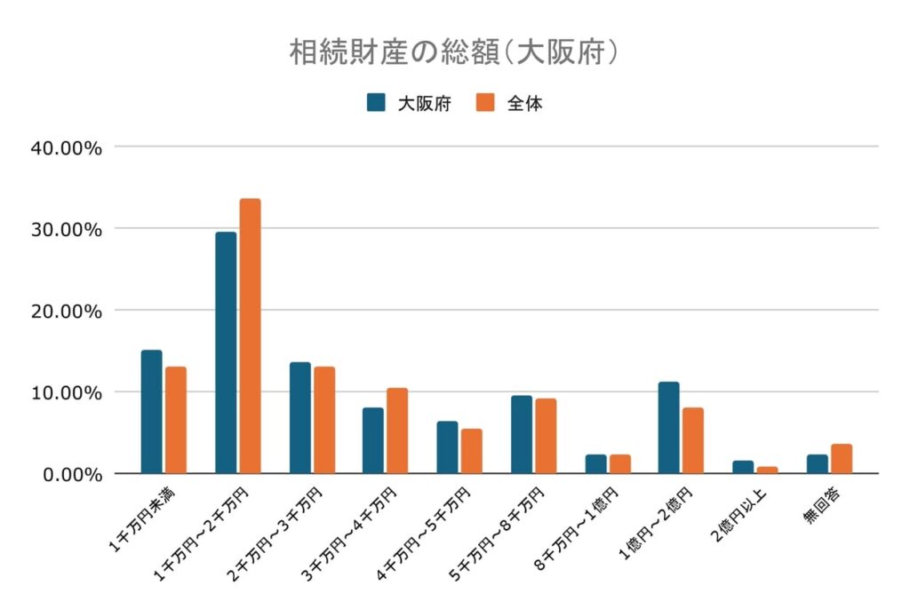 大阪府に住む人の相続では相続財産の総額が1,000万円以上~2,000万円未満が最多で、29.60%となりました。