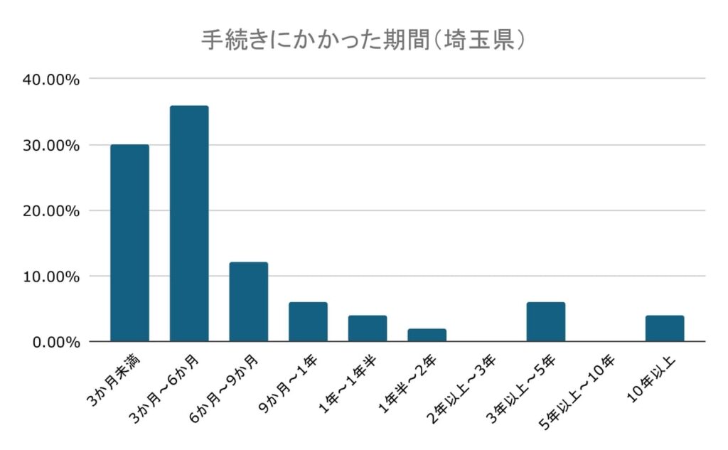 手続きにかかった期間は3か月~6か月未満が最も多く36.00%、次に3か月未満が30.00%、6か月~9か月未満が12.00%、9か月~1年未満が6.00%となりました。