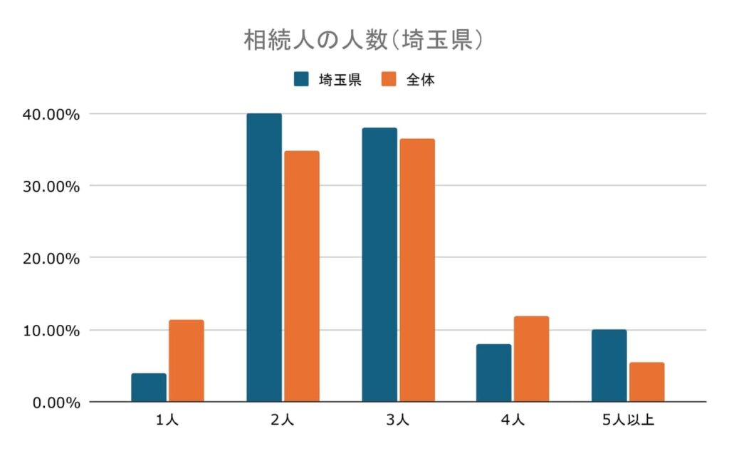 埼玉県に住む人の相続は、相続人1人もしくは4人となる場合は少ないものの、5人以上はむしろ全体と比較して多いとわかりました。