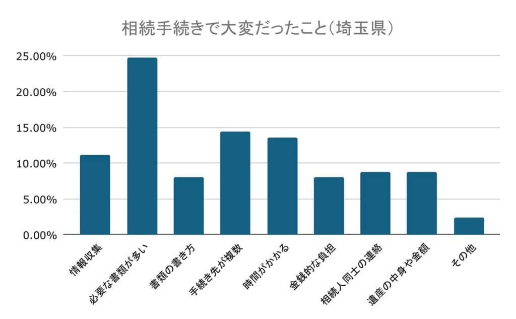 埼玉県の相続で大変だったことという質問では、「必要な書類が多い」が24.80%と、他と10%ほど離して最多となりました。また「手続き先が複数」が14.40%、「時間がかかる」が13.60%と続きます。「情報収集」は11.20%でした。その他の「書類の書き方」「相続人同士の連絡」「遺産の中身や金額の確認」もある程度選択されました。