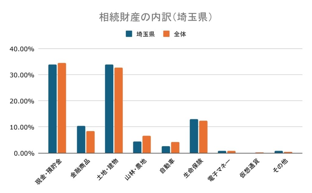 埼玉県に住む人の相続財産内訳は、現金・預貯金と土地・建物が同じく33.91%でした。