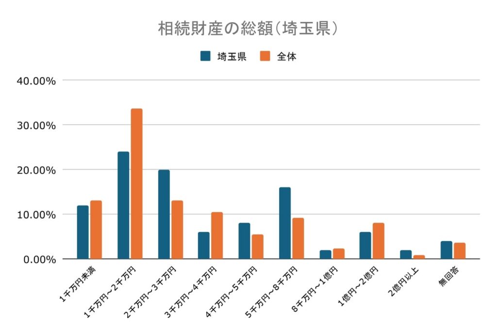 埼玉県に住む人の相続財産総額は、全体と比較して1,000万円以上~2,000万円未満が少なく、それに対し2,000万円以上~3,000万円の割合が高くなりました。また5,000万円以上~8,000万円も全体に比べて高くなっています。