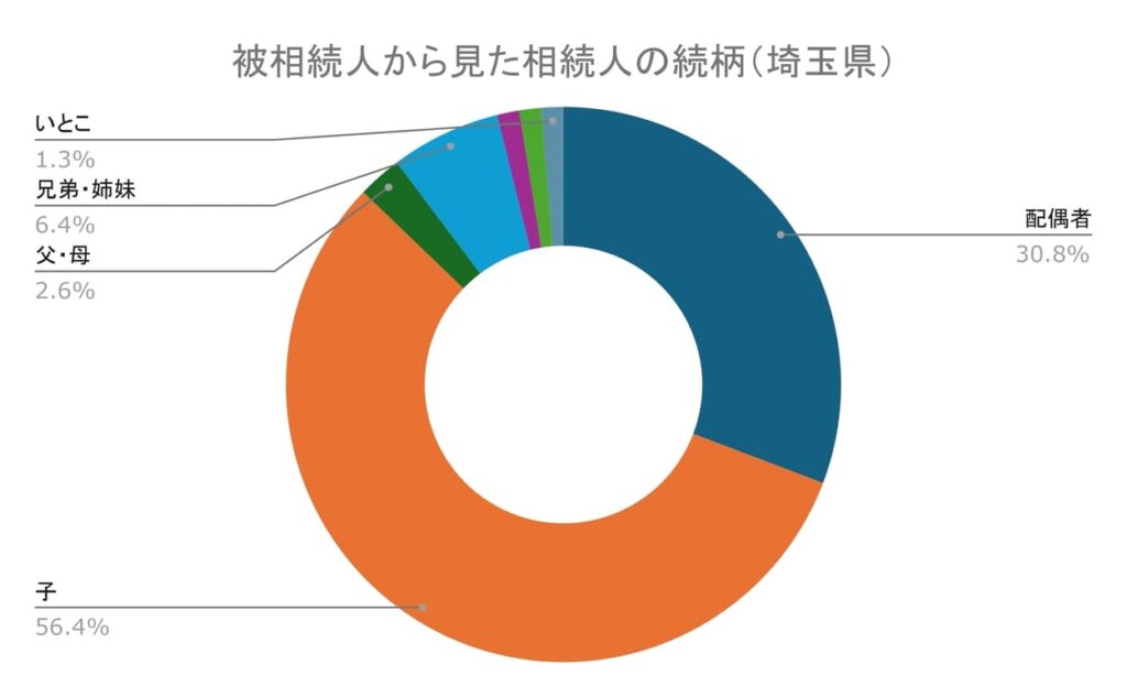 埼玉県の相続について、被相続人(亡くなった人)から見た相続人との続柄は、子が他より圧倒的に多く56.41%でした。父母の相続が大多数であることがわかります。