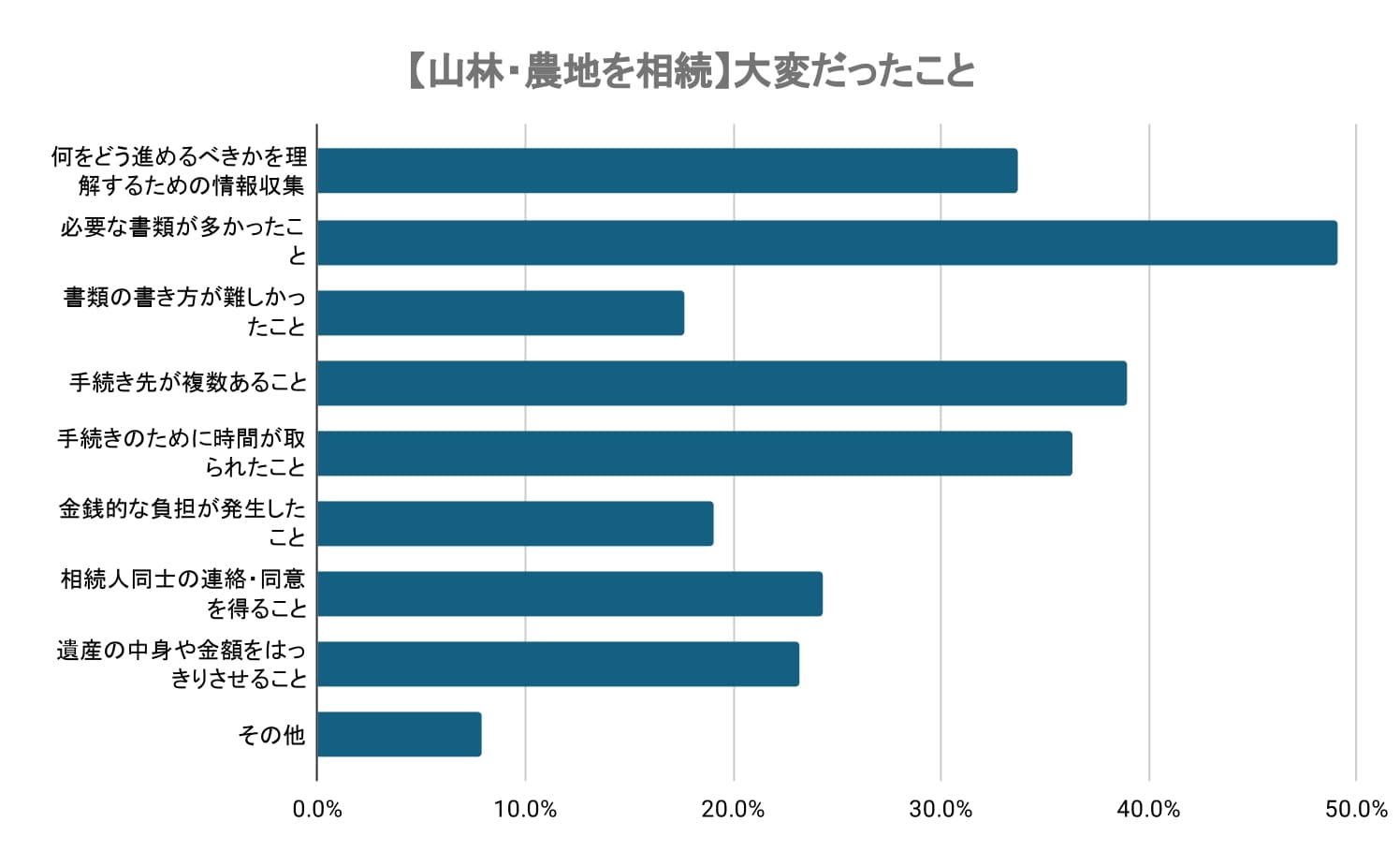 山林や農地の相続において、手続きで最も多くの人が困難を感じたのは「必要な書類が多かったこと」(49.1%)でした。相続に関する手続きには、戸籍関係書類や本人確認書類、不動産に関する証明書類など多岐にわたる書類が必要となるため、その準備が大きな負担となっていたことがわかります。