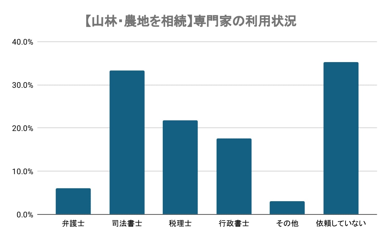 一方で、何らかの専門家に依頼した人も過半数を占めており、最も利用が多かったのは「司法書士」(33.3%)でした。これは、相続対象に山林や農地といった不動産が含まれるため、登記変更などの手続きに専門性が必要とされるケースが多かったと考えられます。