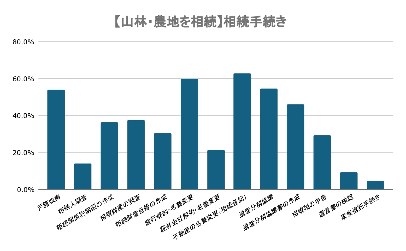 山林・農地を相続した際に最も多く行われていた手続きは、「不動産の名義変更(相続登記)」(62.9%)でした。次いで多かったのは「銀行解約・名義変更」(59.9%)や「遺産分割協議」(54.7%)、「戸籍収集」(53.9%)と続き、相続人の確認や財産の分割に向けた準備も多くの人が行っていることがうかがえます。