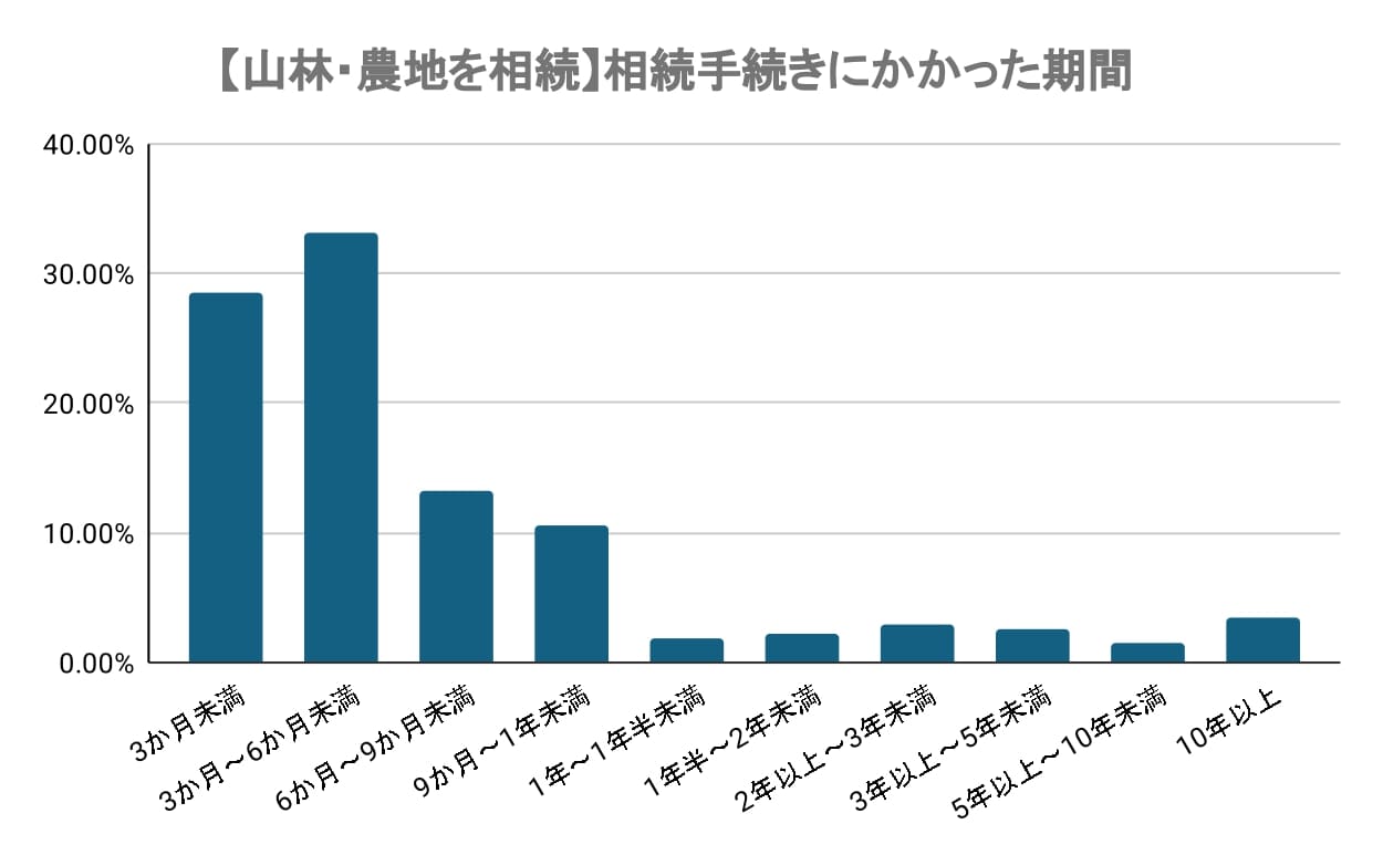 このような結果から、山林や農地の相続では早期に終える人が多い一方で、手続きの内容や状況によっては数年単位で時間を要した人がいることがわかりました。