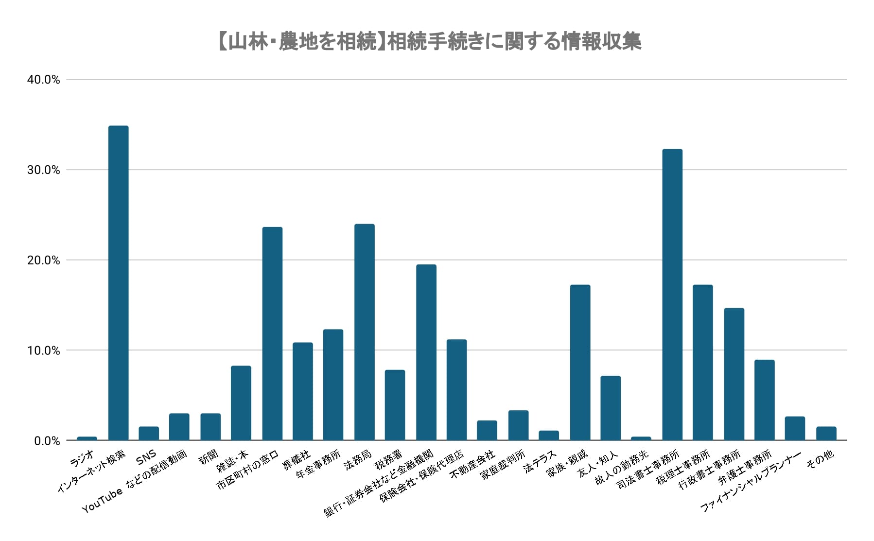 山林・農地を相続した人が相続に関する情報を得る際に最も多く利用していたのは「インターネット検索」(34.8%)でした。
