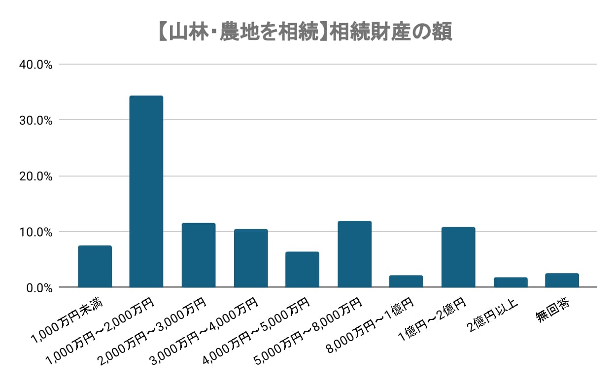 - 山林・農地を相続した人の財産総額は「1,000万円~2,000万円」が最多で、中規模~高額帯が中心