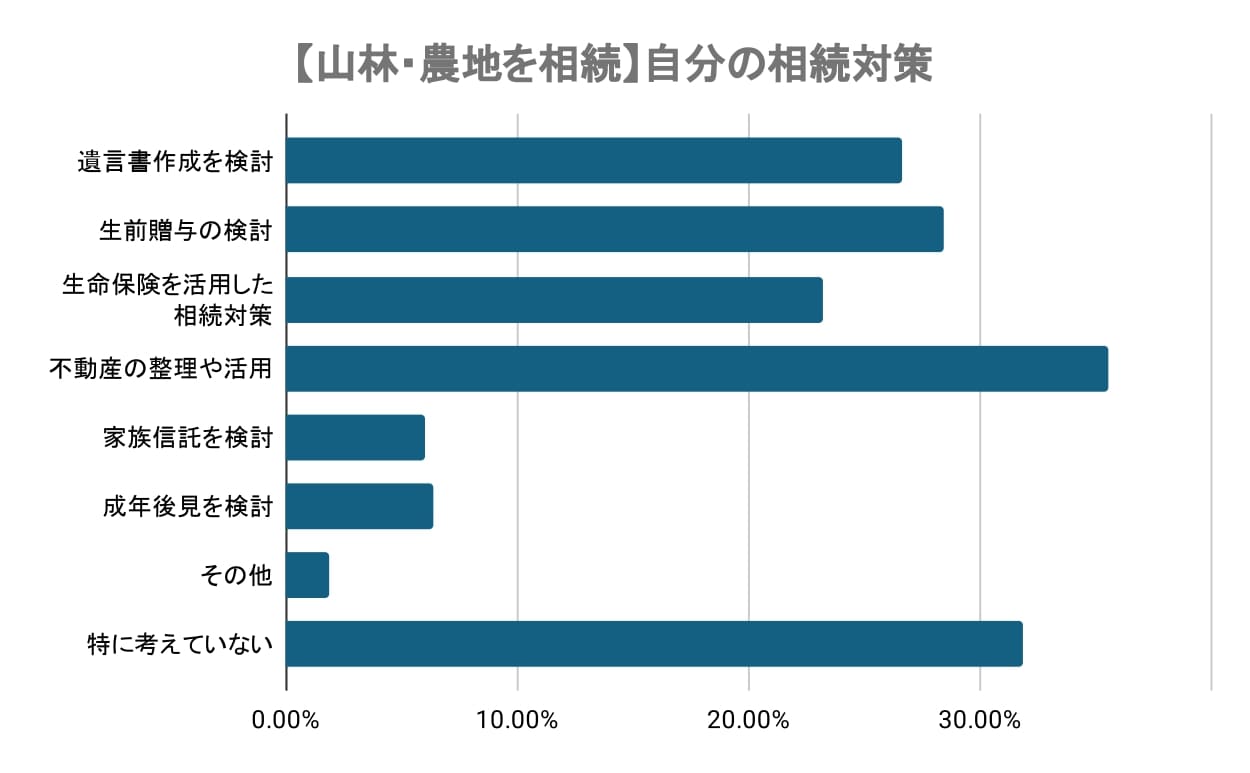 最も多く検討された対策は「不動産の整理や活用」(35.58%)でした。これは、山林や農地の相続を通じて、将来的な活用や処分について考える人が多かったと考えられます。