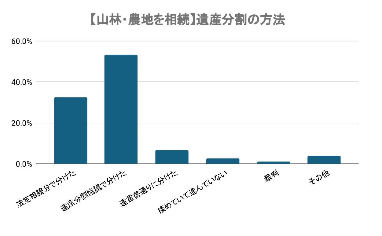 山林や農地を相続した人の中で、最も多かった分割方法は「遺産分割協議で分けた」(53.2%)でした。次に多かったのは「法定相続分で分けた」(32.6%)で、この2つの方法だけで全体の85%以上を占めていました。一方で、「遺言書通りに分けた」という人は6.7%にとどまりました。