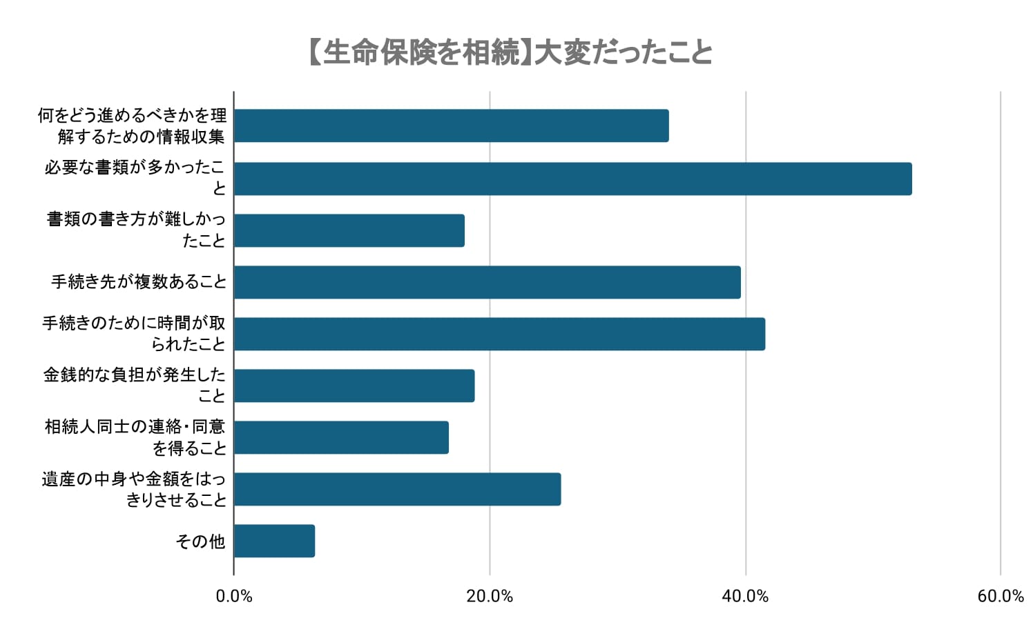 生命保険を相続した人が「大変だった」と感じたこととして最も多かったのは、「必要な書類が多かったこと」(53.1%)でした。相続手続きの際に戸籍謄本や本人確認書類、遺産分割協議書などを求められることが多く、書類の多さが大きな負担となっている様子がうかがえます。