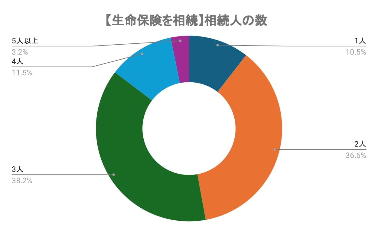 生命保険を相続した人のうち、相続人が2人(36.63%)または3人(38.22%)というケースが全体の約75%を占めており、少人数での相続が主流であることが分かります。一方で、相続人が1人だけというケースも10.50%を占めました。